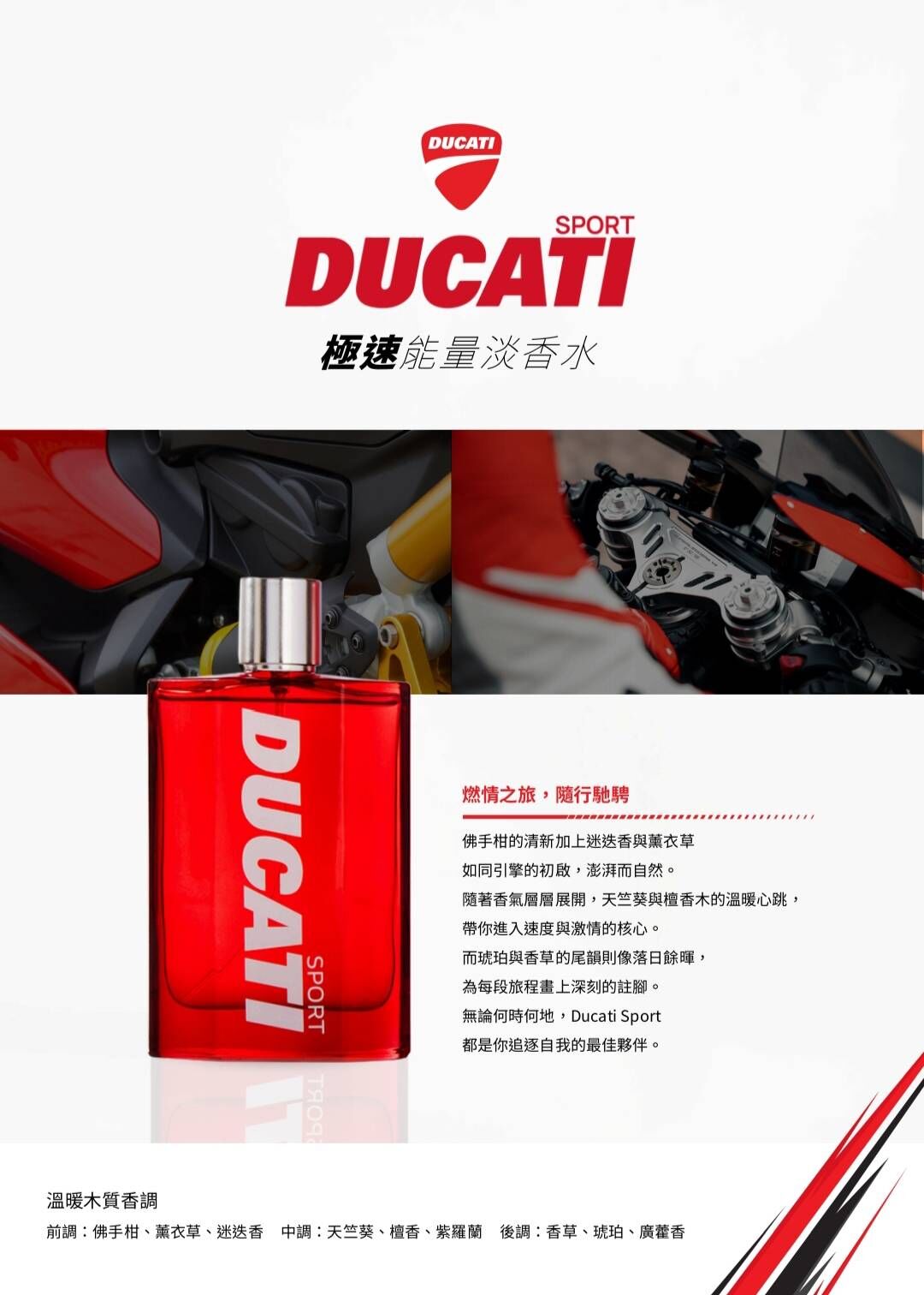 佛手柑的清新加上迷迭香與薰衣草如同引擎的初啟,澎湃而自然。隨著香氣層層展開,天竺葵與檀香木的溫暖心跳,帶你進入速度與激情的核心。而琥珀與香草的尾韻則像落日餘暉,為每段旅程畫上深刻的註腳。無論何時何地,Ducati Sport 都是你追逐自我的最佳夥伴。