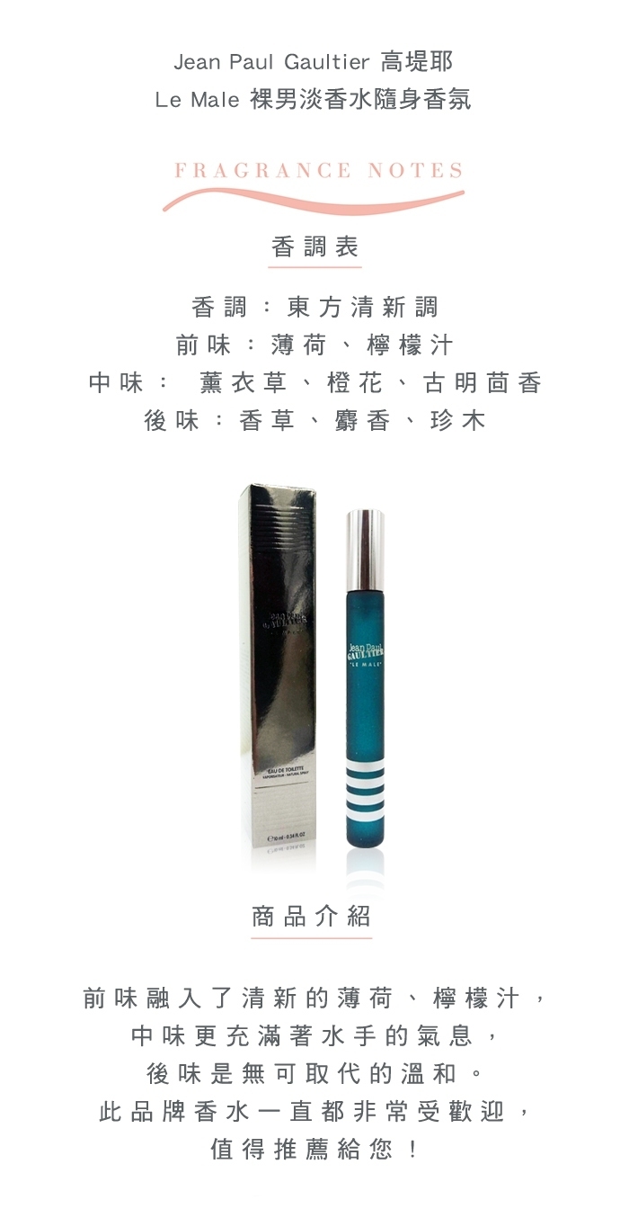 Le Male有別於一般的香水,前味融入了清新的薄荷、檸檬汁,中味的薰衣草、橙花和古明茴香更充滿著水手的氣息,後味的香草、麝香和珍木更是無可取代的溫和。