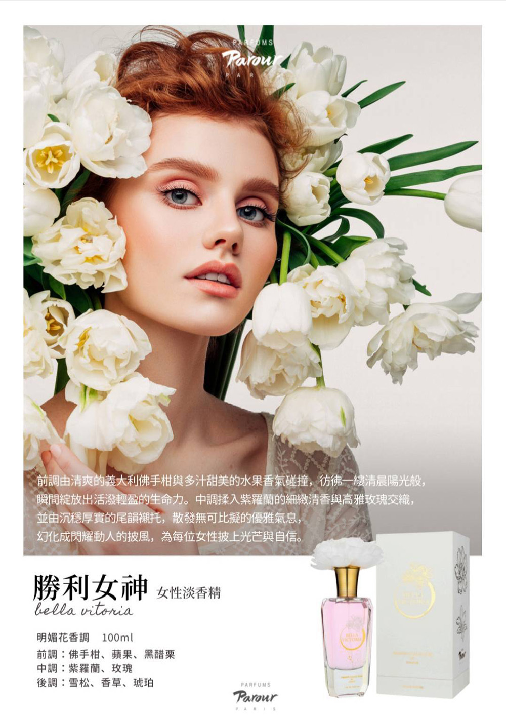 前調由清爽的義大利佛手柑與多汁甜美的水果香氣碰撞,彷彿一縷清晨陽光般,瞬間綻放出活潑輕盈的生命力。中調揉入紫羅蘭的細緻清香與高雅玫瑰交織,並由沉穩厚實的尾韻襯托,散發無可比擬的優雅氣息,換化成閃耀動人的披風,為每位女性披上光芒與自信。