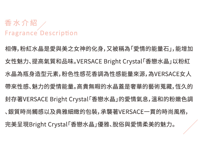 精緻典雅卻又不失生動有趣的石榴香氛,伴隨新鮮清新又飽滿圓潤的柚子清香從時尚精緻的水晶瓶身中流洩出來,同時間,豐富的浪漫香氛迷霧中,又逐漸傳來濃郁的木蘭花、牡丹以及清新淡雅的蓮花花香,再一次在性感、澄澈透淨的時尚水晶瓶襯托之下展現優雅嫵媚的女性魅力。最後,以極致魅力的琥珀、桃花木、麝香等木質清香延續永恆的「香戀水晶」香氛經典之旅。