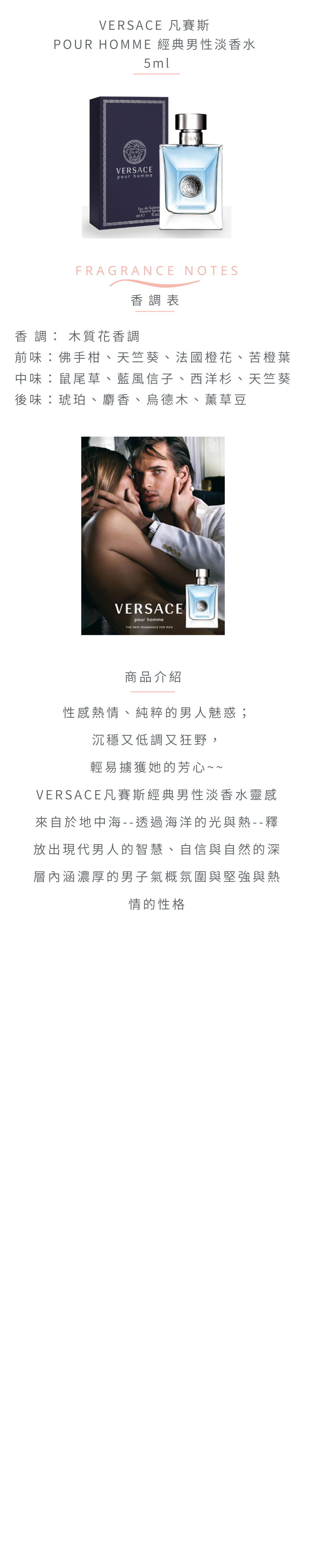 調和陽光與海洋,熱情與力量相輔相成;清雅芬芳的橙花與苦橙葉透著淡淡的苦澀,更強調此香氛的地中海風情,微鹹海風吹擺,鼠尾草和藍風信子的礦質芬芳,西洋杉和天竺葵留下的敏銳與誘惑印象,帶出獨特的魅力。後味奢華性感的琥珀像金黃威士忌流進心底發酵,微醺;黯然的麝香挑起男性的費洛蒙,傳遞裊裊深沉的性感基調。男子氣概的純粹,在此香氛中逐一呈現。